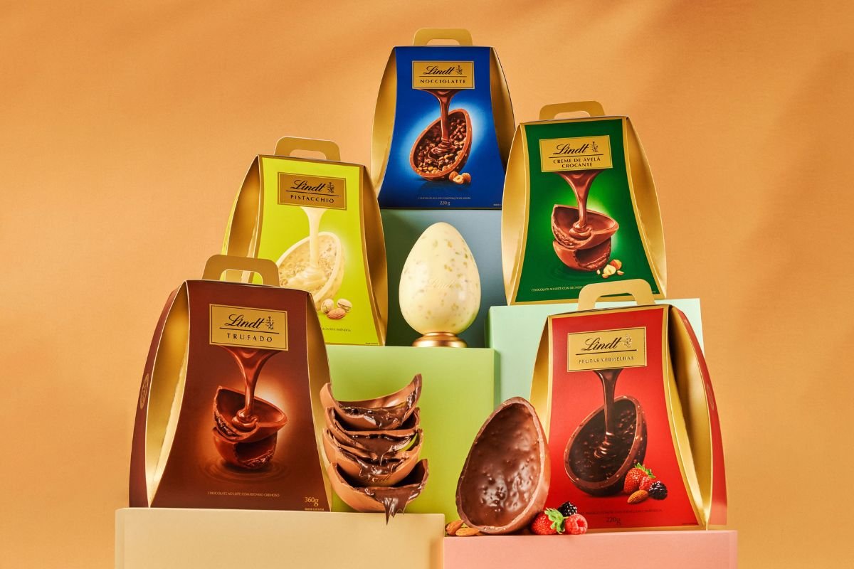 A linha LINDOR permanece como um dos pilares da estratégia para a data. Entre as opções, estão os ovos ao leite, branco e sortido, que reúnem diferentes sabores de trufas e seguem como escolhas tradicionais para presente.