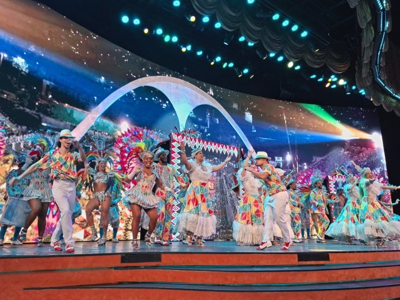 São dezenas de artistas, dançarinos e músicos em cena, acompanhados por projeções imersivas e uma trilha que mistura samba, bossa nova, funk e ritmos regionais.