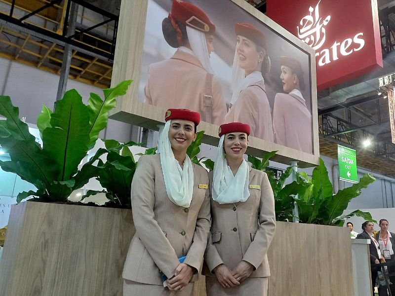Comissárias de bordo da Companhia aérea Emirates em seu luxuoso estande na WTM Latin América 2025 – Crédito – Dalton Assis – AC News