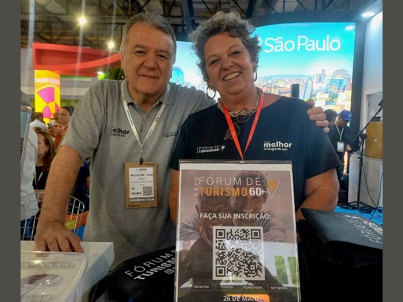 Guilherme Fussi e Patricia Campos da Revista Melhor Viagem 60+ presentes no estande de São Paulo – Crédito – Dalton Assis – AC News