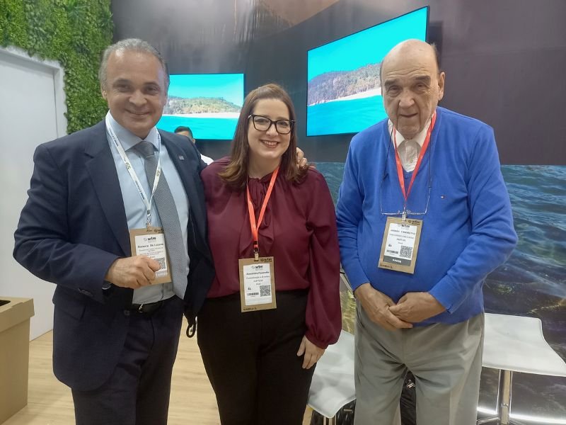 Roberto de Lucena (Setur-SP) (a esq), Alexandra Favoretto e Jarbas Favoretto da AMITESP no estande de São Paulo – Crédito – Dalton Assis – AC News